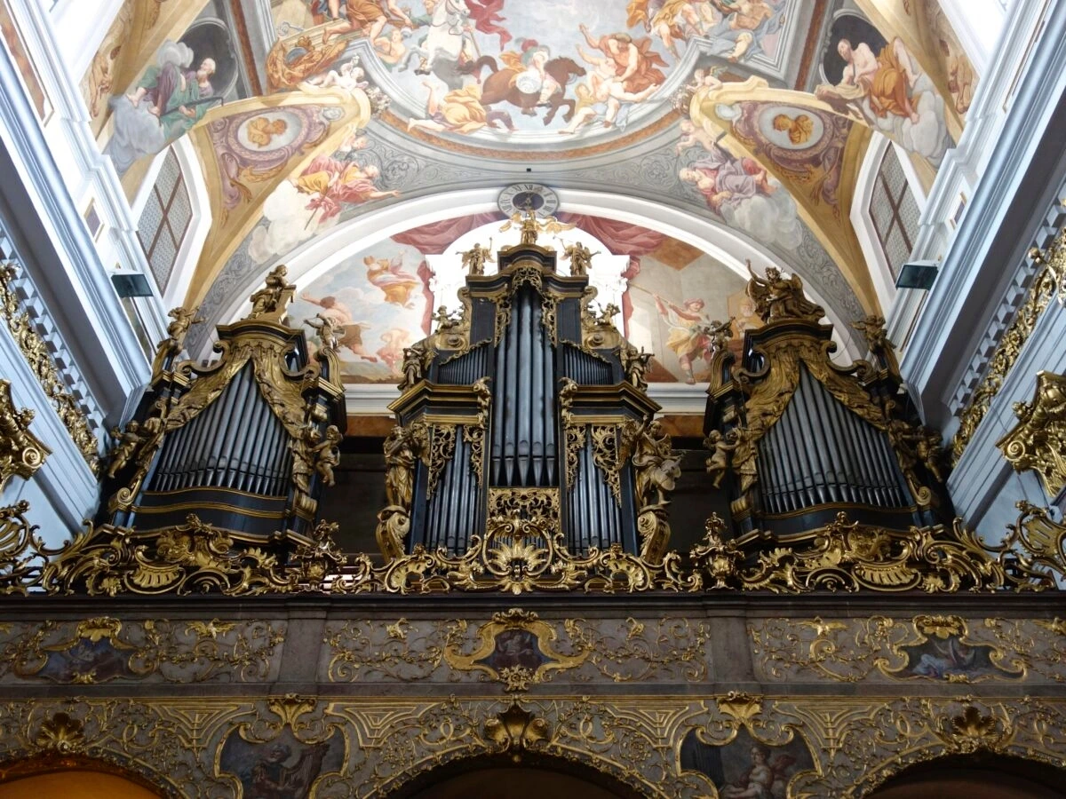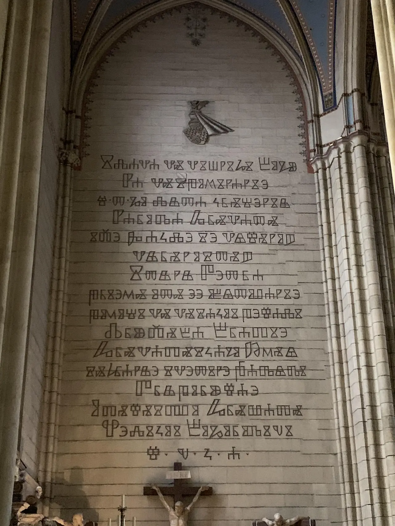 세계적으로 손꼽히는 바로크 양식의 제단과 신고딕 양식의 제단 그리고 보물급 유물이 10개 이상이 있는 성당 안으로 들어가면 제일 먼저 보이는 것이 십자가에 못 박히신 예수님의 조각상 위에 보이는 글라골 문자이다.