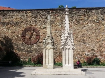 오래된 시계가 가리키는 시간은 7시 3분 3초로 1880년 크로아티아 대지진이 당시 대성당이 무너진 시각이다. 오래된 기둥은 당시 무너진 성당의 기둥이며 새로운 기둥은 1901년에 다시 완공된 모습의 기둥이다.