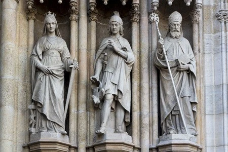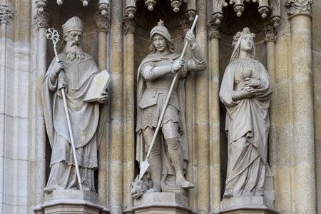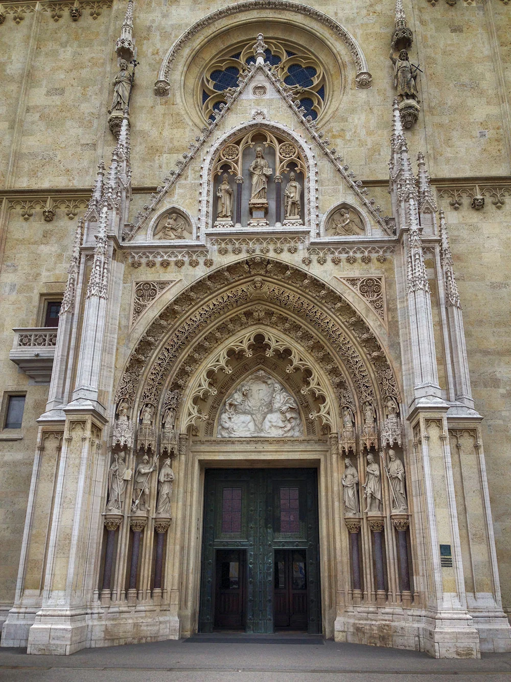 자그레브 대성당 중앙문 위쪽의 삼각 부분 가운데는 예수님이며 왼쪽은 성인 스테판 오른쪽은 성인 라디슬라우스의 조각상이 보인다.
