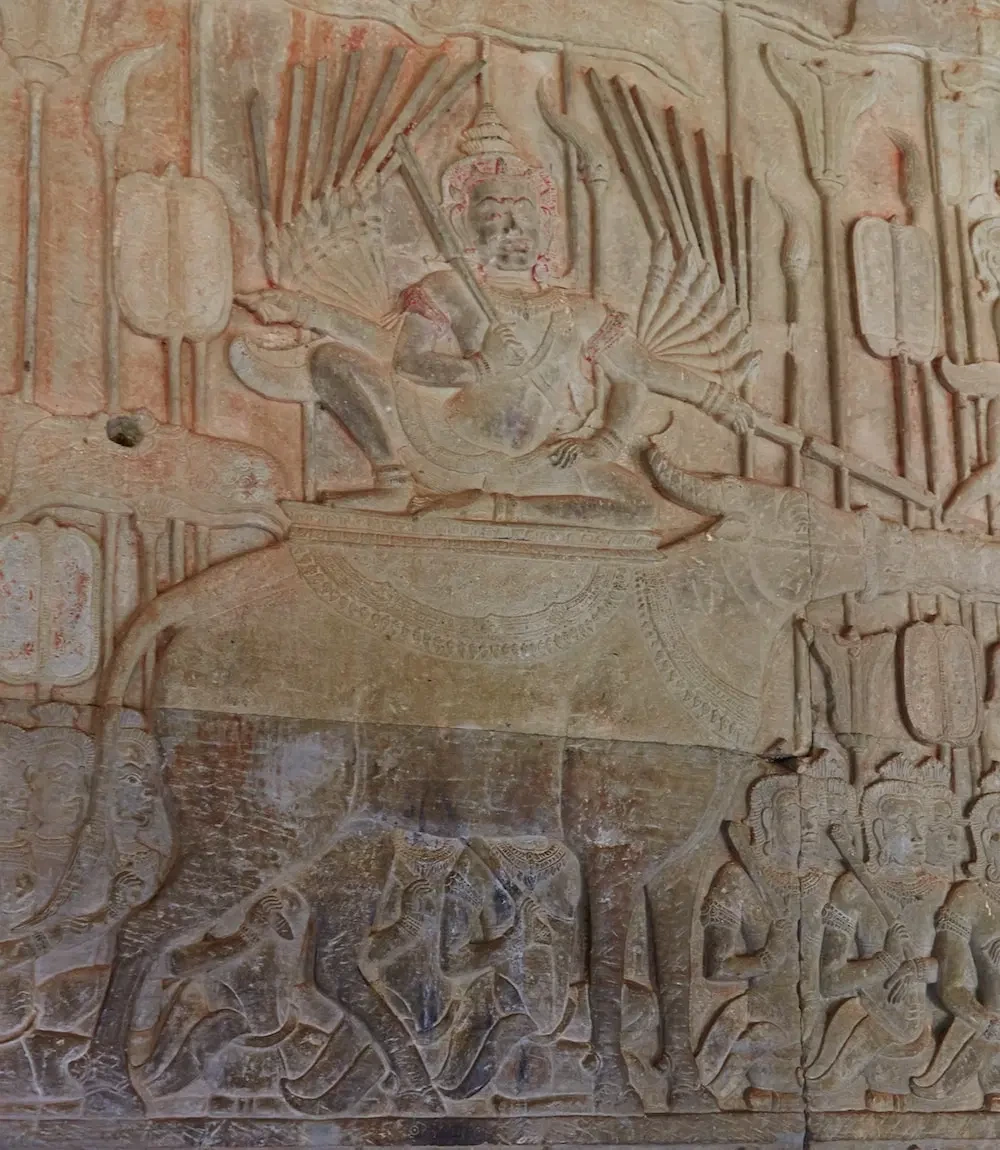 다음으로 천지창조를 보여주는 동쪽 벽면을 살펴보면 힌두 신화에 나오는 우유의 바다 휘젓기 장면이 새겨져 있다.