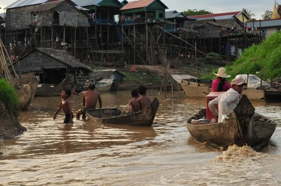 식당을 나와 톤례샵 끝에 있는 수상마을 메이쯔라이로 향한다. 강어귀에 도착하여도 건기로 인하여 강바닥이 보였다. 그래서 한참을 차를 타고 들어가서 가다가 물이 보이는 곳에서 배로 갈아타고 수상마을로 향했다.