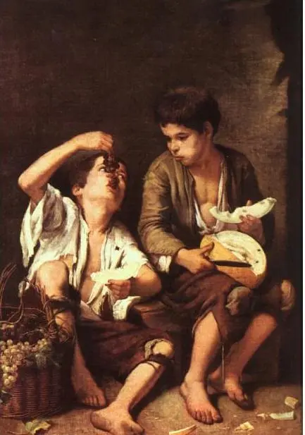 세비야 출신으로 17세기 황금시대를 이끈 무리요는 이 작품에서 바로크식 밝은 빛이 들어오는 가운데 허름한 행색을 한 아이들이 과일을 나눠 먹고 있는 모습을 보여주고 있다. 왼편 아이는 왼손으로 멜론 조각을 든 채 오른손으로 포도를 통째로 입에 넣고 있다. 오른편 아이는 멜론의 두 번째 조각을 먹고 있는데 이 먹은 첫 번째 조각의 껍질이 발아래 이리저리 흩어져 있다. 그리고 단 냄새를 맡은 파리 두 마리가 멜론의 단 속살에 붙어있는 것이 눈에 띈다. 가난하지만 천진난만한 아이들의 모습과 서로를 바라보는 따뜻한 눈빛으로 이 작품이 가난이라는 무거운 사회적 주제를 다루고 있음에도 당시에 많은 사람들로부터 사랑을 받았다.