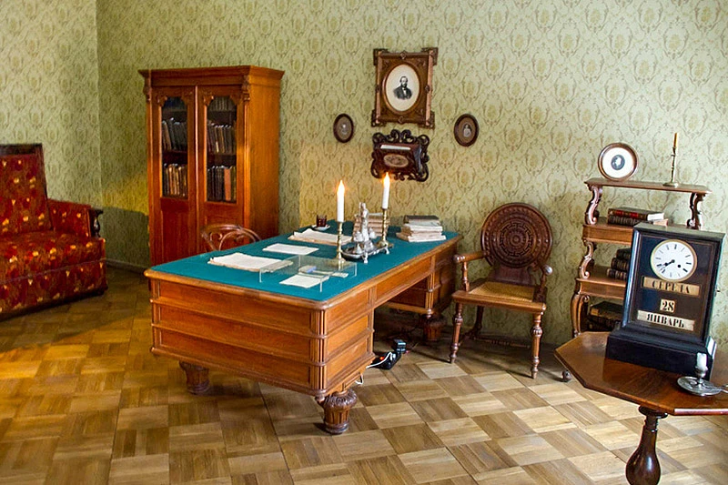 서재는 맨 안쪽에 소파가 있고 그 앞에 책상이 창문을 마주하고 놓여있다. 책상 위에는 두 개의 촛대가 세워져 있다. 소파는 도스토예프스키의 침대이기도 했다. 푸시킨처럼 도스토예프스키도 소파에서 숨을 거뒀다.