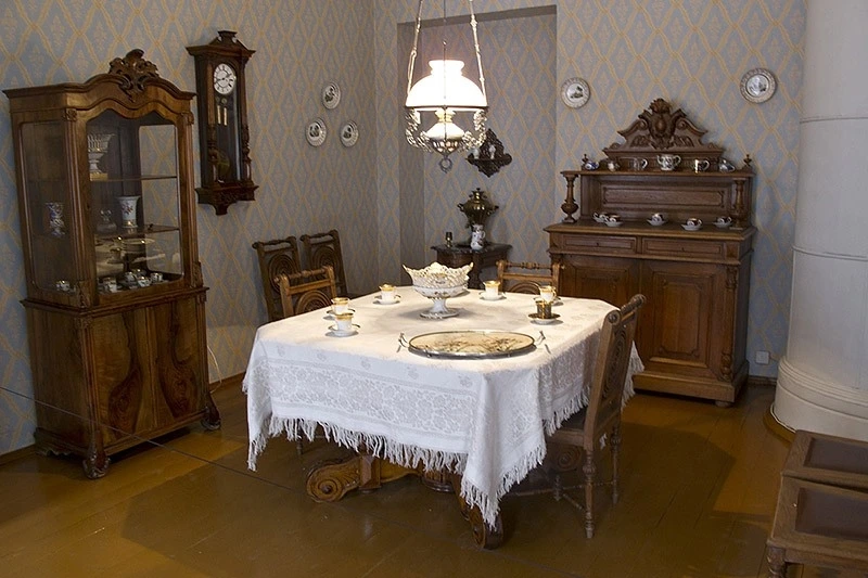 살림집 공간으로 들어가면 도스토예프스키가 쓰던 모자와 우산 등이 전시되어 있는 입구가 나오고 당시 아내 안나의 살림 메모와 주판 그리고 속기 노트 등이 전시되어 있는 안나의 방과 식당이 나온다. 그리고 식당 옆 거실에는 타원형의 노란색 담배 박스가 테이블 위에 놓여있다. 도스토옙스키가 생전에 쓰던 것이다. 여기에 딸 류보피가 도스토옙스키 사망 직후 쓴 글씨가 희미하게 남아있다.
