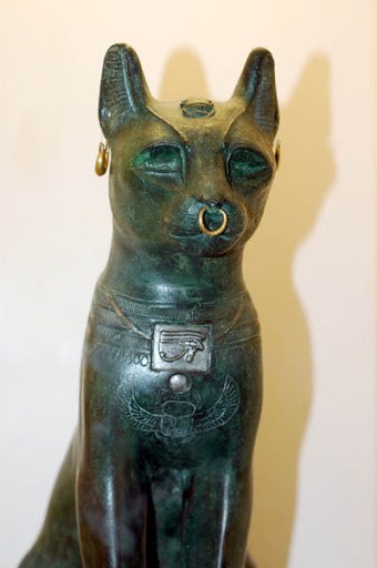 고양이 청동상은 절대 권력을 상징하는 반지를 코에 끼고 있으며 고양이의 이마에는 부활을 상징하는 쇠똥구리가 있고 목걸이에는 보호와 충성을 의미하는 호루스의 눈이 보인다.