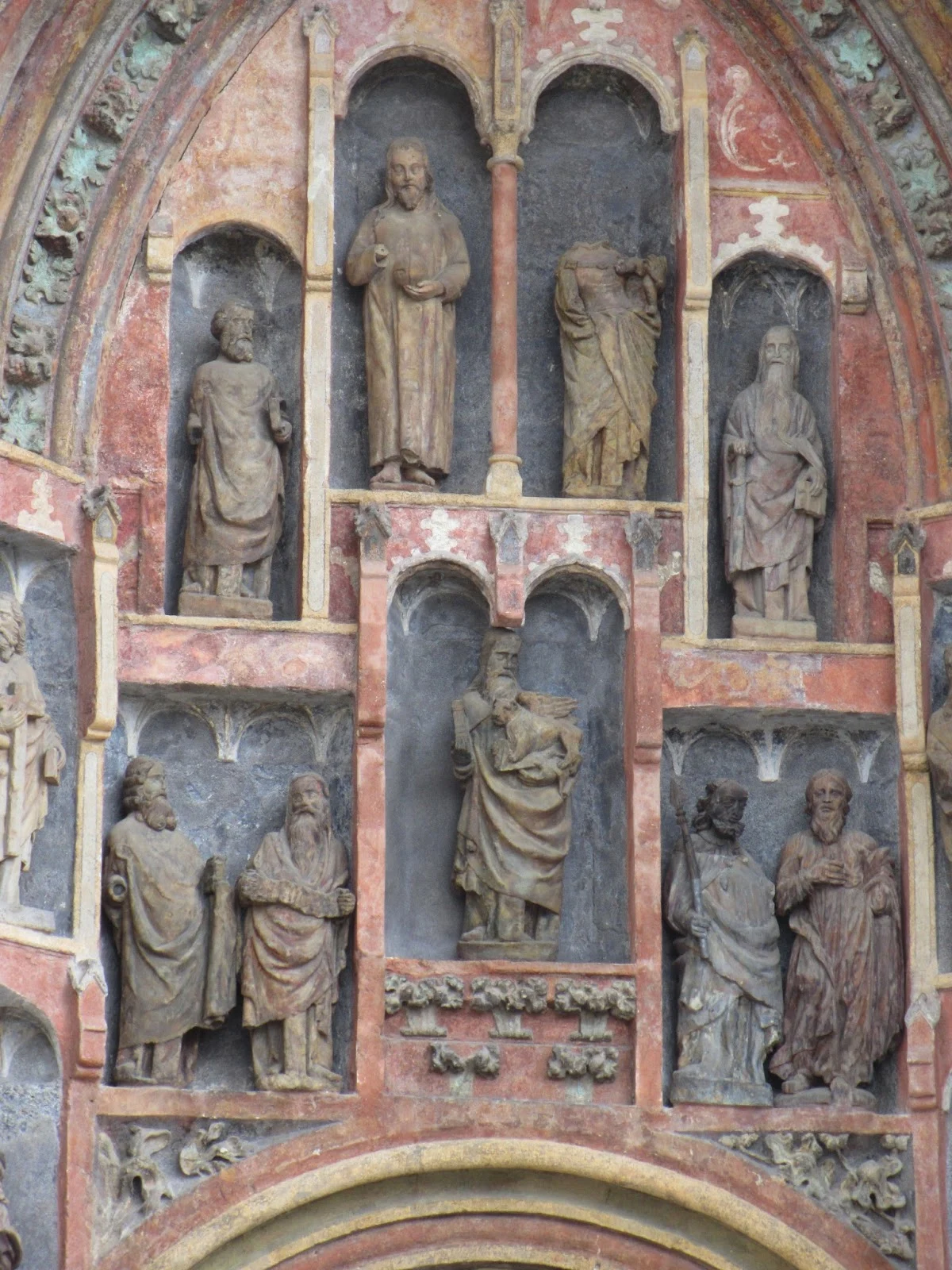 성 마르코 성당 입구는 14세기 말 프라하의 조각가 팔러가 제작한 고딕 양식의 작품으로 11개의 벽감에 15개의 조각상이 있다. 맨 위에는 예수와 아기 예수를 안고 있는 성모 마리아 조각상이 보이며 양쪽 측면에는 예수의 12제자의 조각상이 보인다. 이 조각상은 정교하고 예술적 가치가 높아 성당의 자랑이자 발칸에서도 가장 풍부하고 소중한 고딕 양식의 보물이라고 한다.