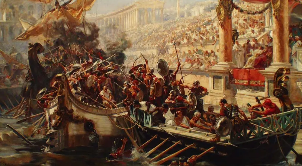 콜로세움은 모의 해전을 위해서 밖에서 끌어온 물을 3층 높이에서 받아 수로를 통해 2층과 1층 그리고 지하층으로 내려 경기장 지하부터 차곡히 채워 경기장 전체를 바다로 만든다. 물이 차면 전투함들이 떠오르고 전투를 시작한다. 노예나 적의 포로들을 상대편 배에 실어 실제적인 전투를 벌인 해상전투는 당시 로마인들의 최고 오락 거리였다.