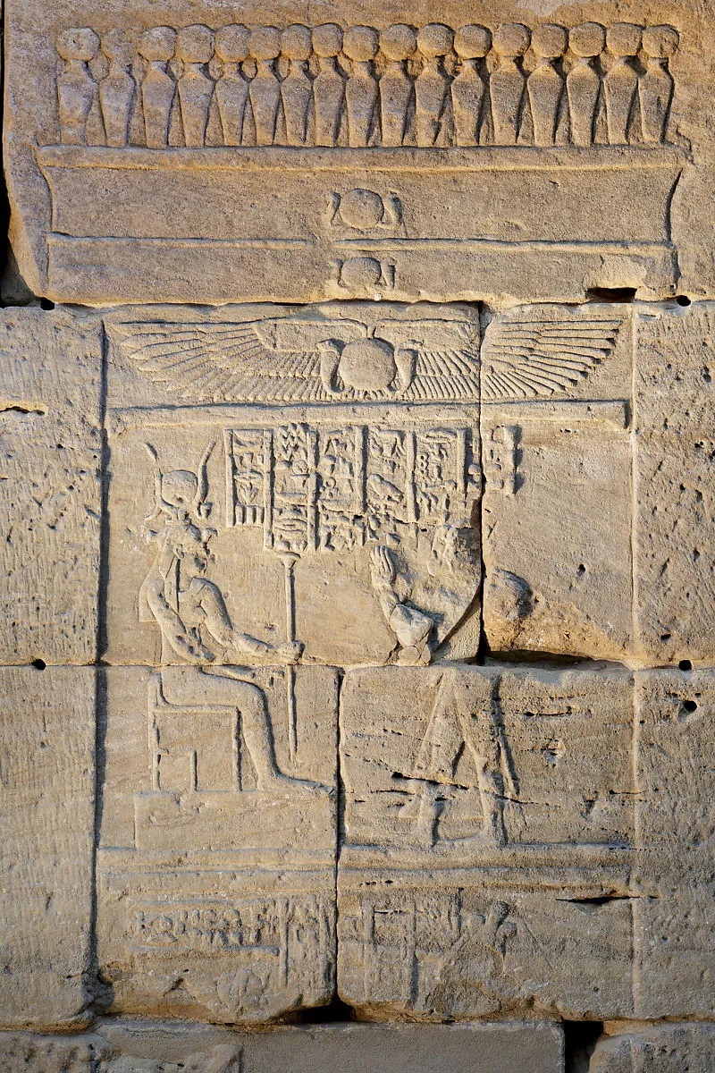 기둥 위로 날개를 펼친 지상의 왕이자 신인 호루스 모습을 볼 수 있다. 이집트 신화에 다음과 같은 내용이 있다.