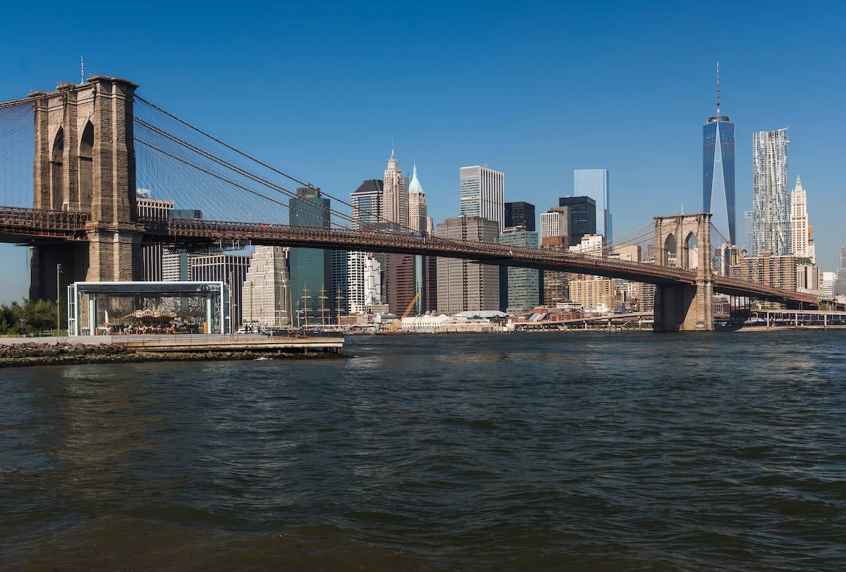 1883년에 완공한 브루클린 다리는 길이가 무려 1,825m로 세계에서 가장 긴 현수교로 도보로 다리를 건너는 것이 가장 낭만적이다. 바닥이 나무로 된 다리를 건너면 미국을 대표하는 영화 <원스 어폰 어 타임 인 아메리카> 의 포스터에 나오는 장소가 나온다. 이것에 도착하면 여행자들은 사진 찍기에 여념이 없다. 사진의 백미는 다리 사이로 엠파이어 스테이트 빌딩을 넣어서 찍은 것이다.