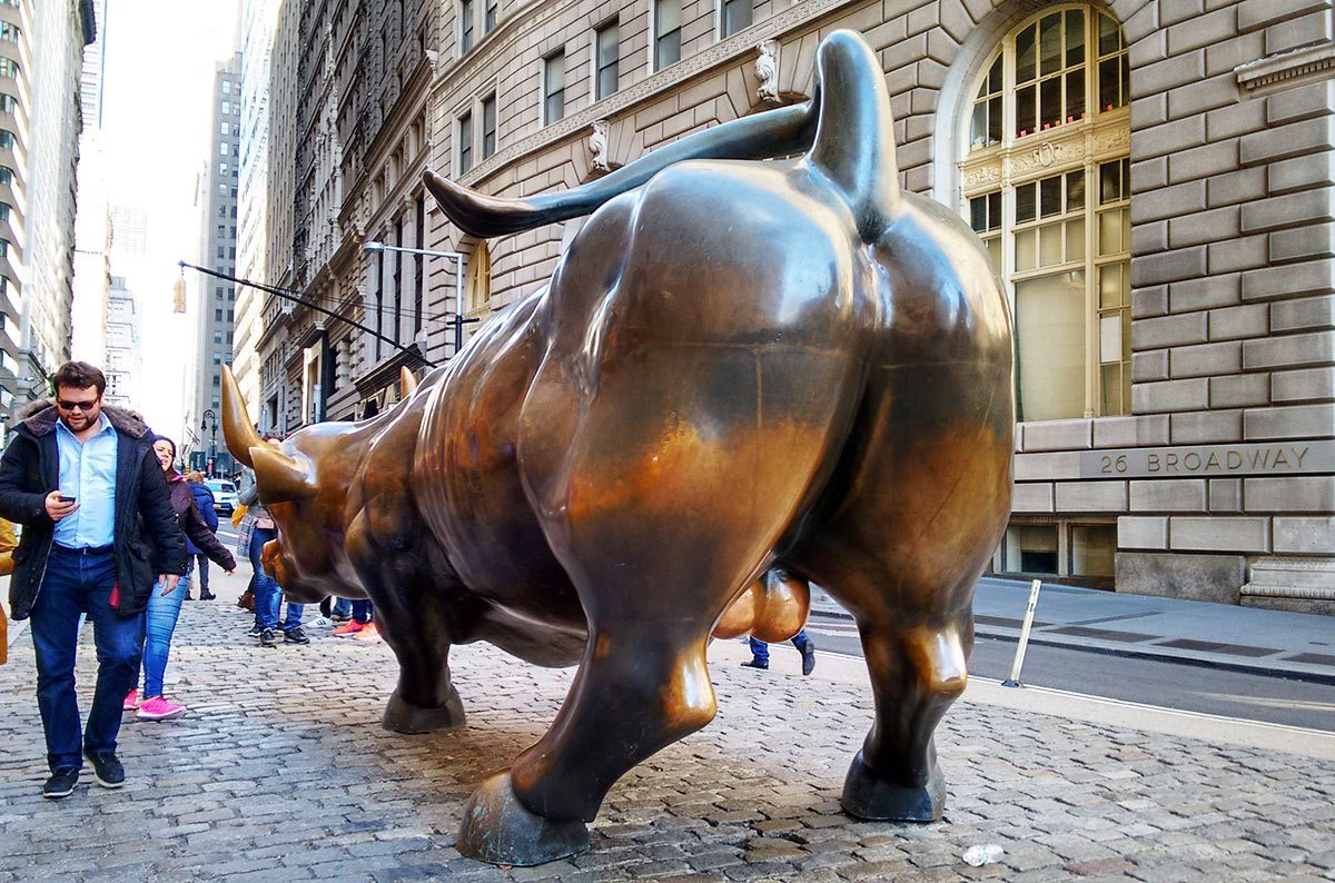 월가의 랜드마크로 <돌진하는 황소> 동상이 있다. 황소상의 뿔과 고환을 만지면 큰 부를 얻는다는 속설이 있어서 사람들이 하도 만져 반질반질하게 빛나고 있다.