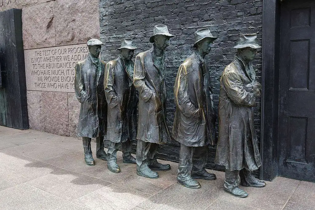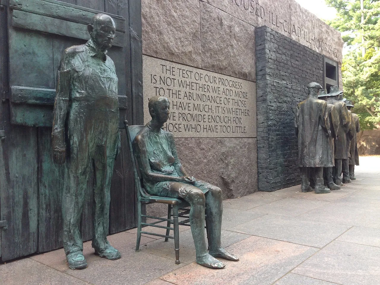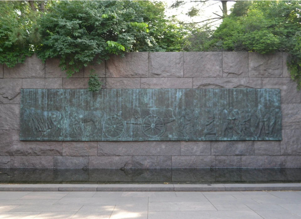 루스벨트의 취임 장면을 재현한 부조 작품이 보이는 첫 번째 전시실로 들어가면 보이는 폭포는 대공황의 도래를 상징한다. 두 번째 전시실에는 대공황 시대에 시골 부부와 빵을 기다리는 사람들 그리고 라디오를 듣는 사람의 조각품이 있다. 특히 마지막 작품은 당시 라디오를 통해 직접 미국인들의 단합을 호소한 루스벨트의 소통의 리더십을 상징한다.