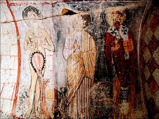 중앙의 그리스도의 오른쪽 벽면에 그려진 세 명의 성인은 성 바실리오와 성 토마스 그리고 성 오노프리우스다. 왼쪽의 오노프리우스를 자세히 보면 얼굴에는 수염이 있으나 가슴은 여자처럼 볼록하게 나와 있다. 오노프리우스는 원래 여인으로 방탕한 생활을 하였다가 죄를 회개한 후 남자가 되게 해달라고 기도를 한 결과 결국 남자로 변하게 되었다고 한다.