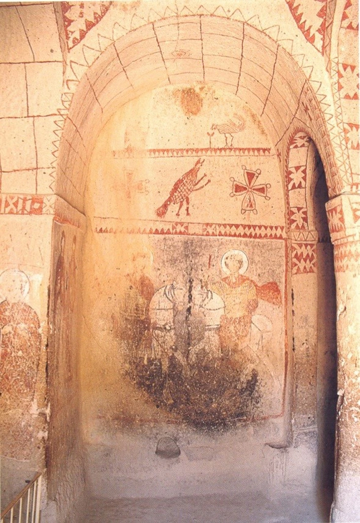 교회안으로 들어가면 입구 맞은편에는 손에 책을 든 그리스도가 보이고 그의 왼쪽에는 커다란 십자가를 중심에 두고 콘스탄티누스 황제와 그의 어머니 헬레나가 보인다. 그리고 바로 옆에는 바르바라 교회와 같이 뱀과 싸우는 성 그레고리우스와 성 테오도로의 모습이 그려져 있다.