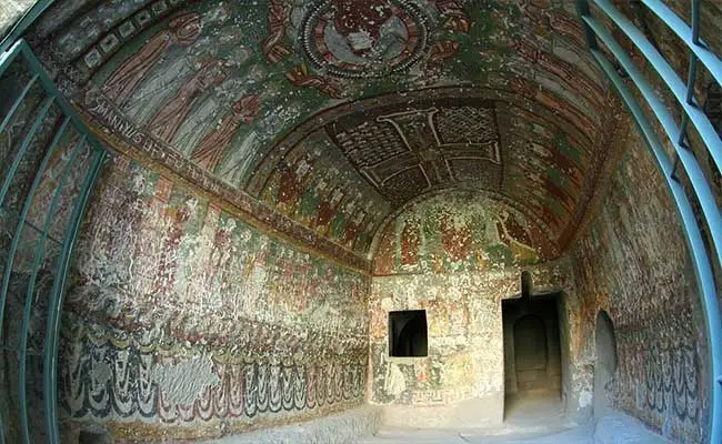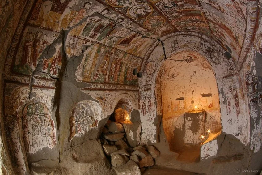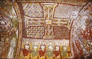 동굴 교회 안으로 들어가면 입구 위 벽에는 그리스도에게 인간의 벌을 가볍게 해달라고 요청하는 성모 마리아와 세례자 요한의 모습이 보인다. 그리고 왼쪽 벽에서 수태 고지와 예수의 탄생 그리고 동방 박사의 숭배 장면을 볼 수 있으며 오른쪽 벽에서는 최후의 만찬과 배신 그리고 십자가 처형을 볼 수 있다. 또한 천장에서 축복을 주시는 하나님의 손과 함께 큰 그리스 십자가를 볼 수 있으며 그 아래로 사도들이 보인다.