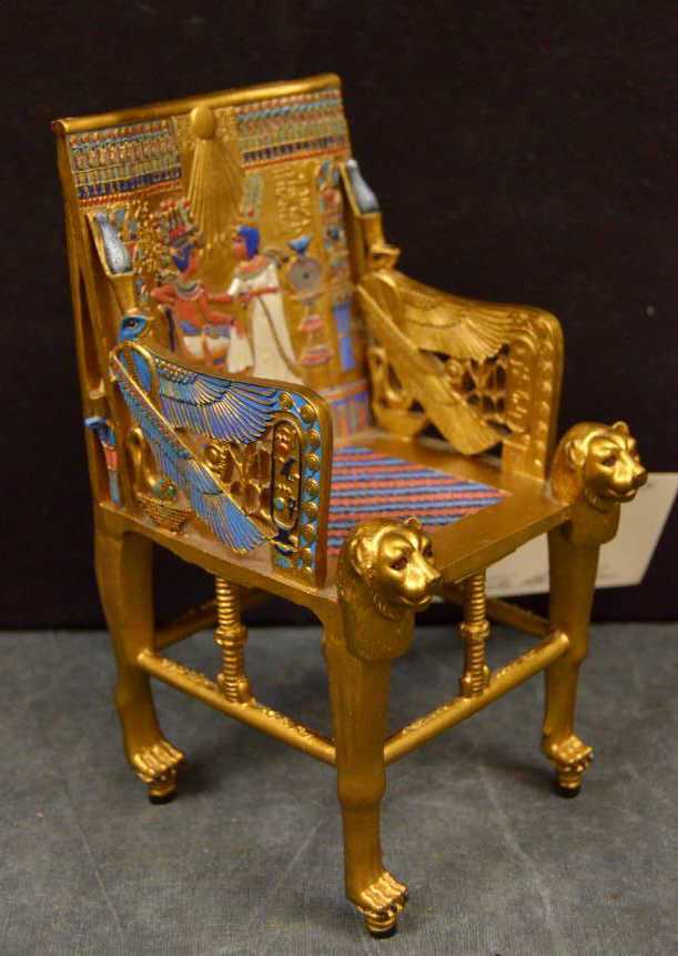 먼저 황금 의자의 팔걸이에는 멋진 날개를 펼친 독수리가 장식되어 있다. 그리고 팔걸이 아래에는 갈기 달린 수사자가 파라오를 지키고 있는데 수사자의 다리 네 개가 의자의 다리 역할을 하고 있다. 의자 뒤쪽에는 코브라가 버티고 서서 뒤에서 접근하는 적으로부터 파라오를 보호하고 있다. 또한 의자의 등받이 부분에는 투탕카멘과 그의 부인이 보이는데 두 사람 위로 태양의 신인 아톤이 광선을 쏘며 축복하고 있다. 전체적으로 투탕카멘의 항금 의자는 왕의 권위와 위대함을 보여준다.