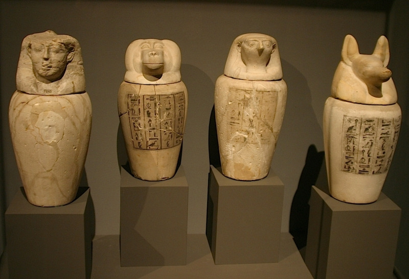 이 항아리들은 말린 장기를 담은 것으로 네 개가 한 세트이다. 카노푸스라고 부르는 항아리 뚜껑에는 각 장기의 수호신 모습이 조각되어 있다. 사람 머리를 한 임세트는 간을 담고 원숭이 머리를 한 하피는 허파 그리고 재칼의 머리를 한 두아무테프에는 위를 담으며 매의 머리를 한 케페세누프는 창자를 담았다.