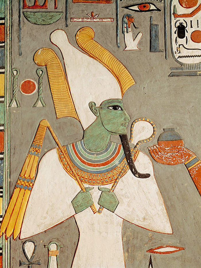 사자의 서 가장 오른쪽에 저승의 왕 오시리스가 보인다. 두 번을 죽고 부활한 오시리스의 얼굴은 녹색을 띠고 있다.