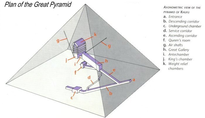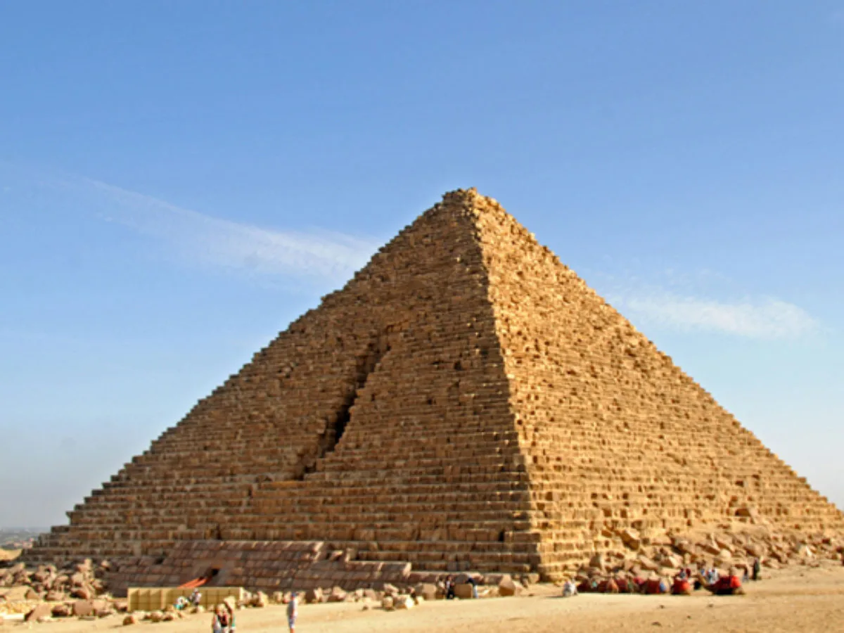 기자에 있는 세 피라미드의 주인공은 기원전 2,600년에 활동한 고왕국 4 왕조의 파라오인 쿠푸 할아버지와 카프레 아버지 그리고 멘카우레 아들이다. 그 나이순으로 피라미드의 크기가 줄며 나란히 서 있다.