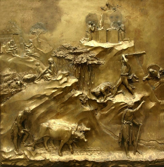 피렌체 바르젤로 성당에 가면 당시 경합했던 두 청동부조를 볼 수 있다. 이를 본 대부분의 사람들은 생동감이나 긴장감에 있어서 단연 브루넬레스키 작품이 우세하다고 이야기한다. 그러나 당시 심사위원들은 기베르티의 작품을 선정하였다. 그의 작품이 청동이 적게 들어 비용이 저렴하였기 때문이었다.