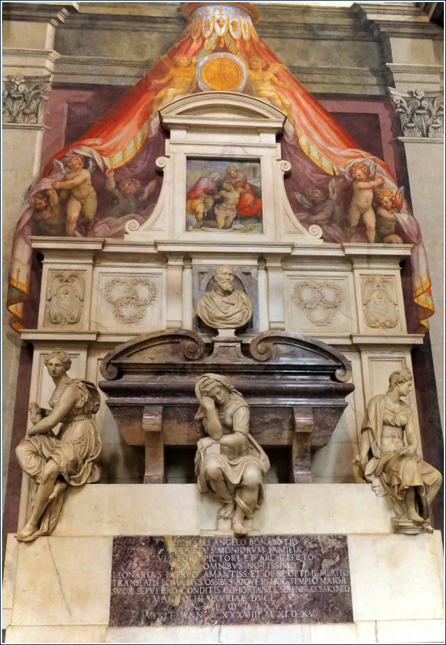 사후 미켈란젤로는 로마에 묻혔다가 고향 피렌체의 산타 크로체 대성당으로 이장되었다. 당시 미켈란젤로의 유해를 로마에서 피렌체로 빼돌리기 위해 피렌체 측에서는 군인들까지 보냈다고 한다. 군대를 움직인 예술가의 장례는 구름처럼 몰려든 피렌체 시민들에 의해서 성대하게 치러졌다. 미켈란젤로의 무덤에 새겨진 라틴어 묘비명은 다음과 같다.