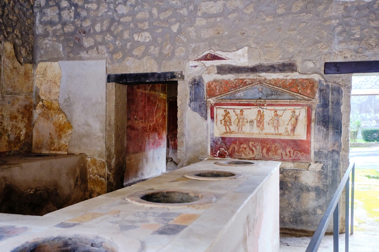 포룸을 지나면 델라본 단차 거리가 나온다. 이 거리에는 수많은 술집과 여관 그리고 세탁소와 빵집들이 늘어서 있었다. 고소한 빵 냄새로 손님들을 유혹한 빵집에는 커다란 오븐이 아직 그대로 남아 있으며 세탁소에는 빨래를 넣고 사람들이 밟았던 커다란 탕이 보인다. 또한 바퀴 자국이 생생한 거리에는 인도로 마차가 들어오는 것을 막기 위해 도로 중앙에 박혀 있는 돌들을 발견할 수 있다.
