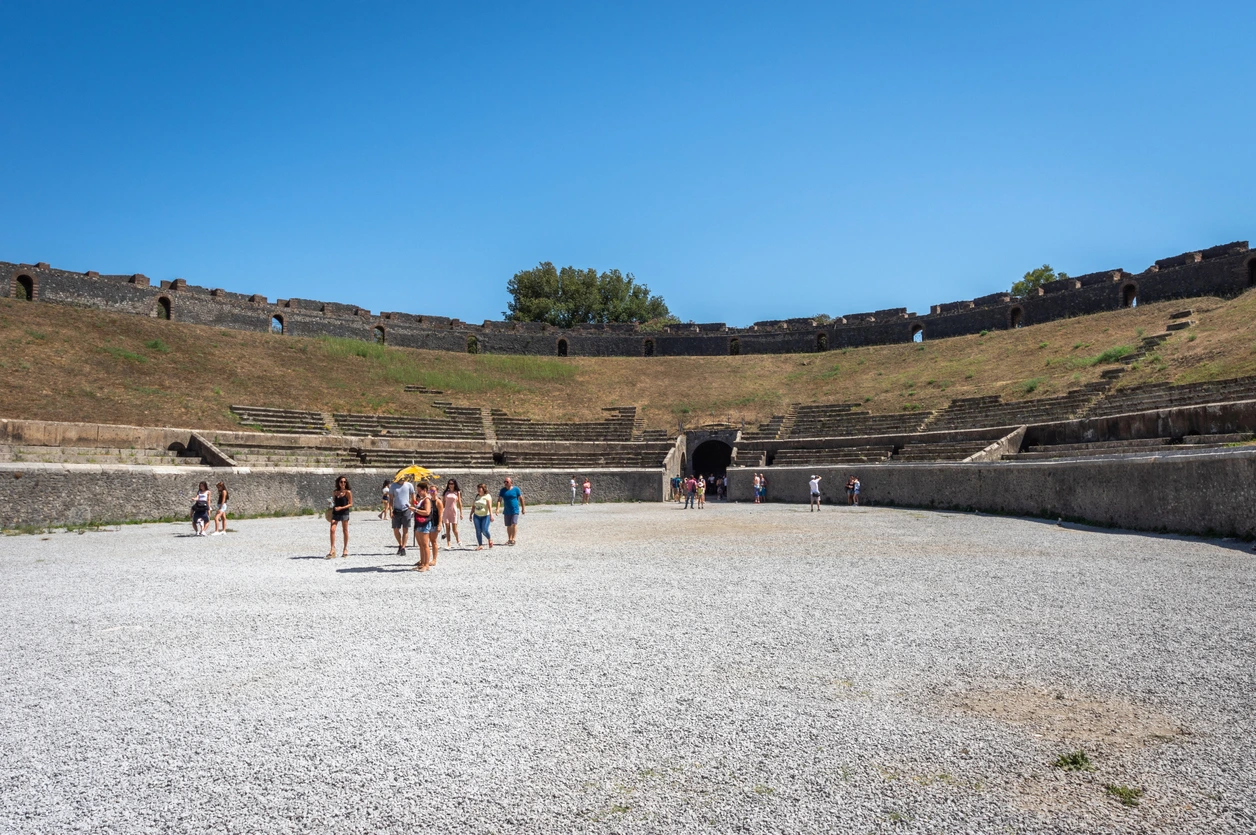 폼페이 유적지에 들어서면 가장 먼저 눈에 띄는 곳은 원형 경기장으로 콜로세움보다 150년이나 일찍 지어진 이곳에서 최대 2천 명의 관객들이 검투사들의 경기를 즐겼다.