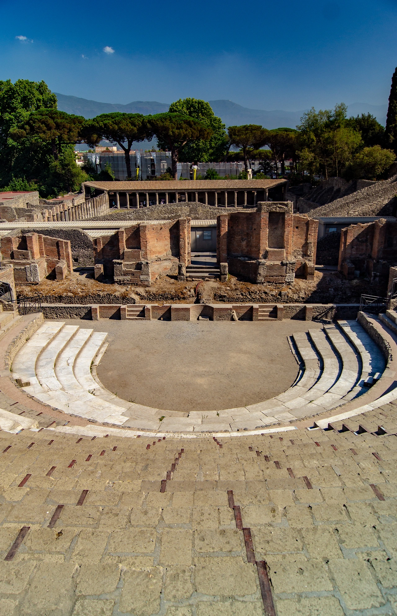 곡물 창고를 지나면 폼페이 유적지의 마지막 방문지인 5천 석 규모의 그리스 극장을 만난다. 극장 뒤에는 사각형 광장이 보이는데 이는 극장 관객들이 쉬는 시간에 거닐 수 있도록 만들어진 공간으로 지진 후에 검투사들을 위한 막사로 사용되었다.