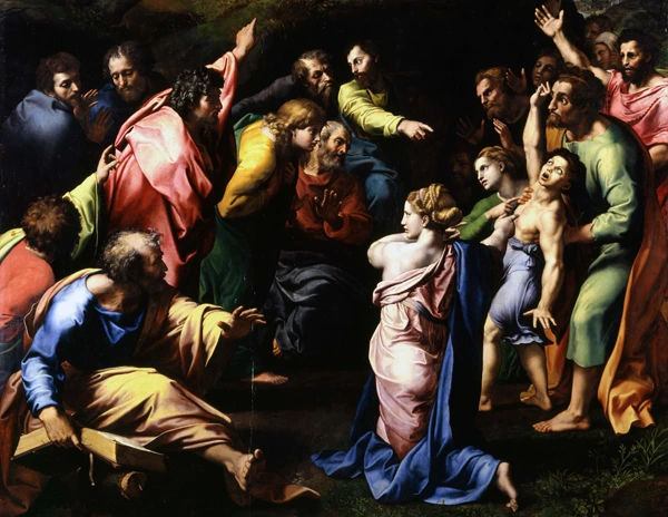 작품 하단에는 예수의 변용을 목격하고 하산하던 제자들이 귀신 들린 아들을 치유해달라는 한 아버지의 사연을 듣게 되자 당황하는 모습으로 예수님에게 물어보라고 이야기하자 예수님은 이는 너희의 믿음이 작은 까닭이라고 답한다.