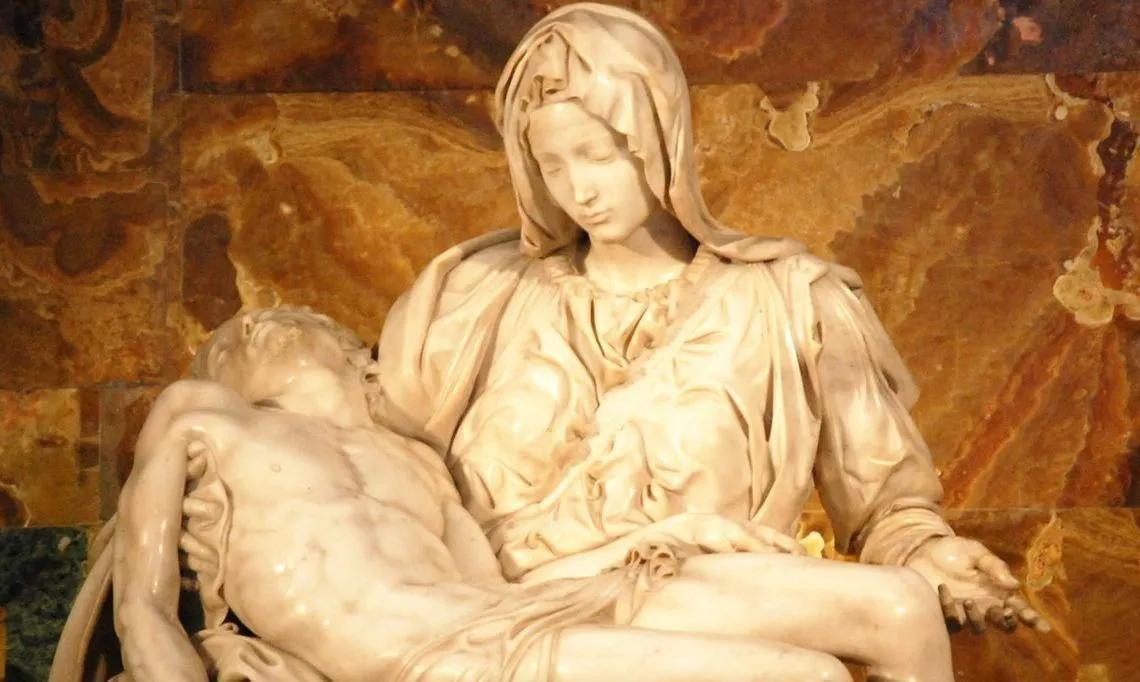 피에타 조각상을 보면 성모 마리아의 왼쪽 팔에 예수님의 얼굴을 둔 채 예수님의 몸을 성모 마리아의 넓게 벌린 다리와 치마 사이에 넣어 완벽한 삼각형 구도를 이루고 있다. 상체와 팔의 근육으로 생동감이 넘치는 예수님의 몸을 잡고 있는 마리아의 오른쪽 손가락은 옷자락에 눌러진 채 사실감을 더하고 있다. 예수 아래로 자연스럽게 펼쳐진 치마주름과 예수를 받치는 마리아의 왼손은 손금이 보일 정도로 섬세하다.