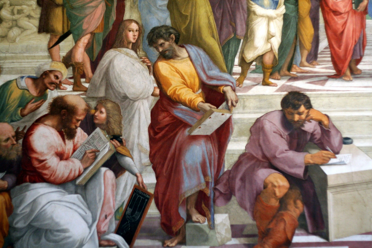 플라톤 옆에서 오른 손바닥으로 땅을 향하고 있는 철학자는 아리스토텔레스이다. 그는 플라톤의 제자이지만 그의 스승과는 상반된 견해를 가지고 있었다. 그는 이상보다는 현실과 경험 속에서 세상의 진실을 찾아야 한다고 주장했다. 특히 그는 인간의 행복을 처음 이야기한 철학자로 진정한 행복은 소유보다는 중용과 덕에 기반한 인간 관계에서 나온다고 이야기하였다.