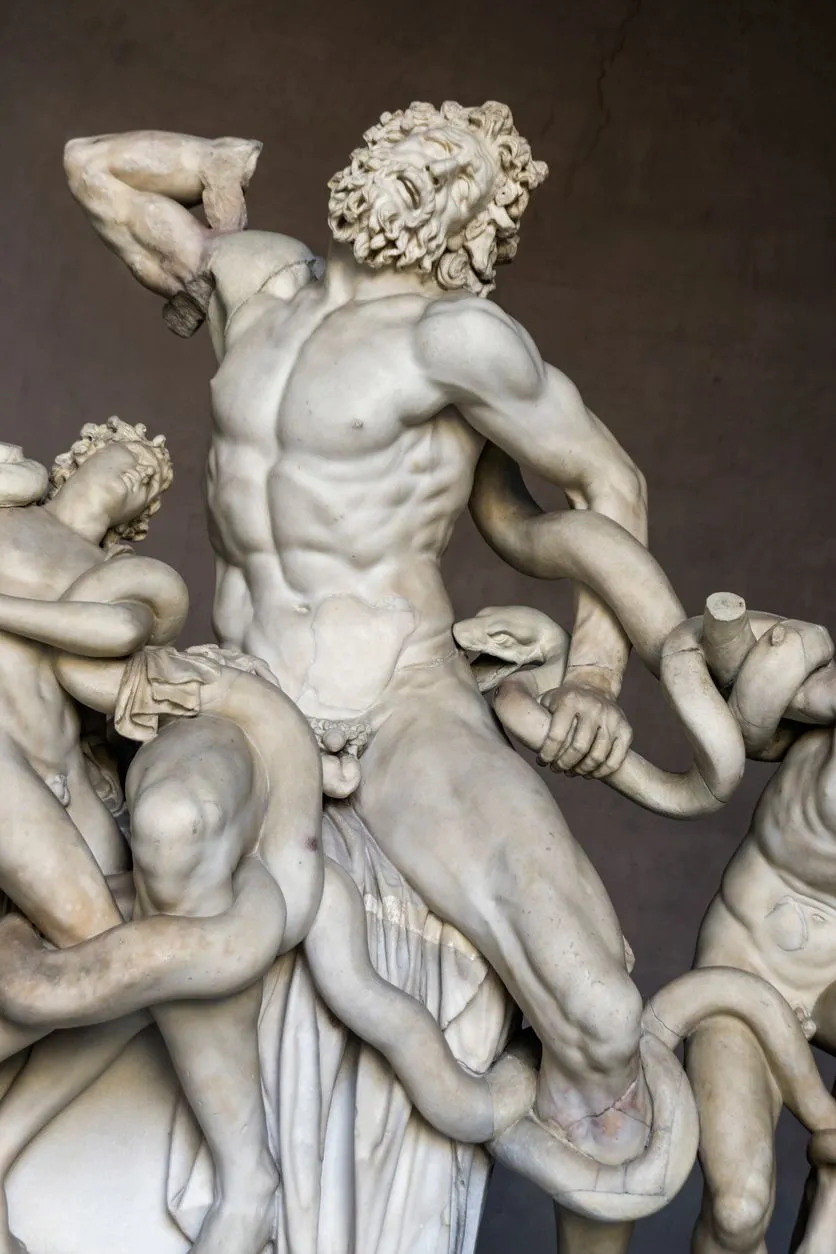 조각의 천재인 미켈란젤로조차 흉내 낼 수 없다고 이야기한 라오콘 조각상은 트로이 목마의 비밀을 폭로한 죄로 두 아들과 함께 뱀에 물려 죽어가는 트로이의 신관 라오콘의 모습을 생생하게 보여준다.