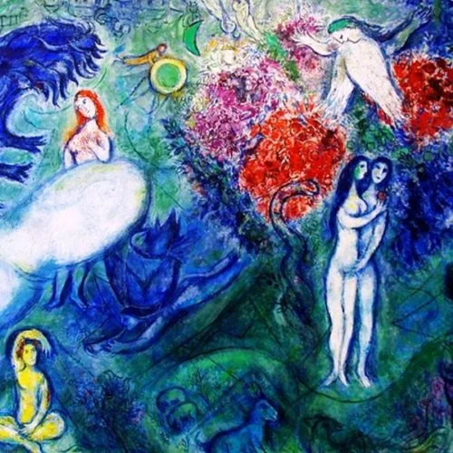 러시아 작은 농촌마을 비테프스크에서 유대인으로 태어난 샤갈은 어릴 때부터 예술적 재능을 인정받아 미술학교를 다녔으며 성인이 되자 화가가 되기 위해 파리로 왔다. 샤갈이 파리에 왔을 때는 야수파와 입체파가 파리를 장악하고 있어 그 영향을 받으며 자신이 세계를 하나씩 창조했다.