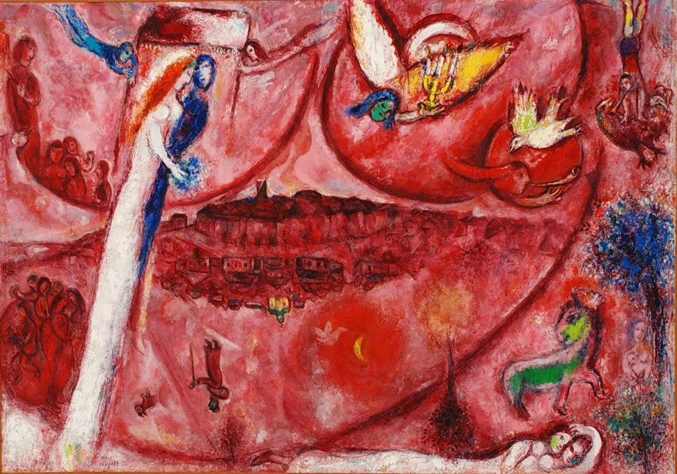 작품 중앙에 예루 살렘을 대신해서 두 개의 도시를 있다. 위쪽은 마지막 20년을 살았던 생폴 드 방스이고 바로 아래 뒤집어진 도시는 샤갈이 태어난 러시아의 비테프스크이다. 두개의 도시 위와 아래로 보이는 둥근 곡선은 여자의 가슴과 배를 상징한다. 작품 오른쪽에 누워 있는 남녀 한쌍은 첫 번째 아내 벨라와 결혼한 모습이다. 그는 벨라를 사랑했으며 그녀가 죽자 한동안 붓을 들지 못했다. 이후 그는 생폴 드 방스에서 두 번째 아내 바바와 살았는데 작품 속 왼쪽의 신랑 신부가 그 모습을 보여준다. 작품 아래쪽 뒤집어진 사람과 왼쪽 구석위에 붓을 들고 있는 사람은 화가 자신이다.
