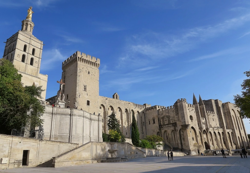 교황청은 아비뇽의 유수 기간 동안 교황 클레멘스 5세를 비롯하여 정식 교황 7명과 대립 교황 2명 등 총 9명의 교황이 거주한 곳으로 유럽의 고딕 양식의 궁전 중에서 가장 큰 규모를 자랑한다. 정문에서 보았을 때 왼쪽 건물이 먼저 증축되어 구 교황청이라 부르고 정문과 첨탑이 있는 오른쪽 건물을 신교황청이라 부른다.