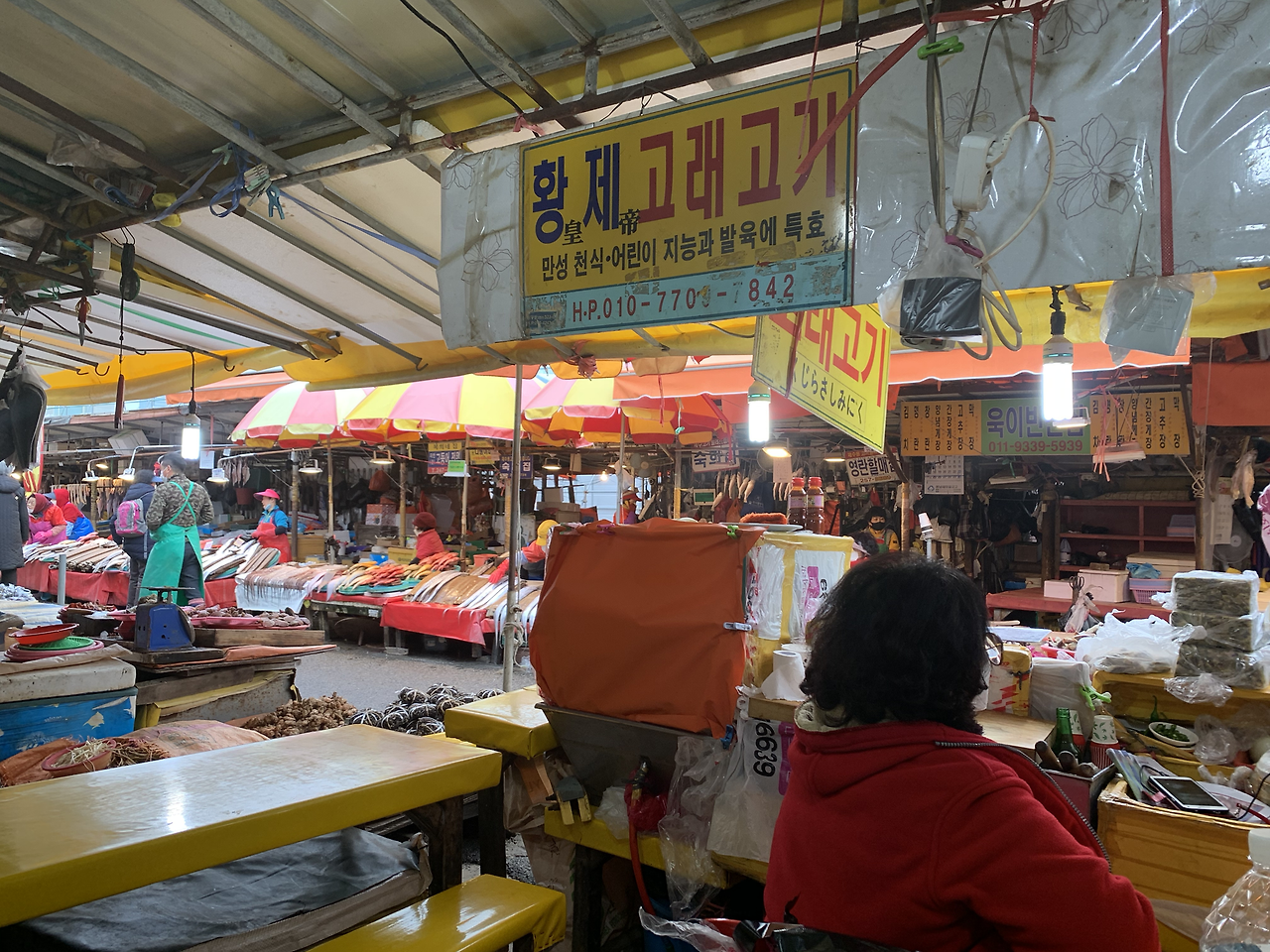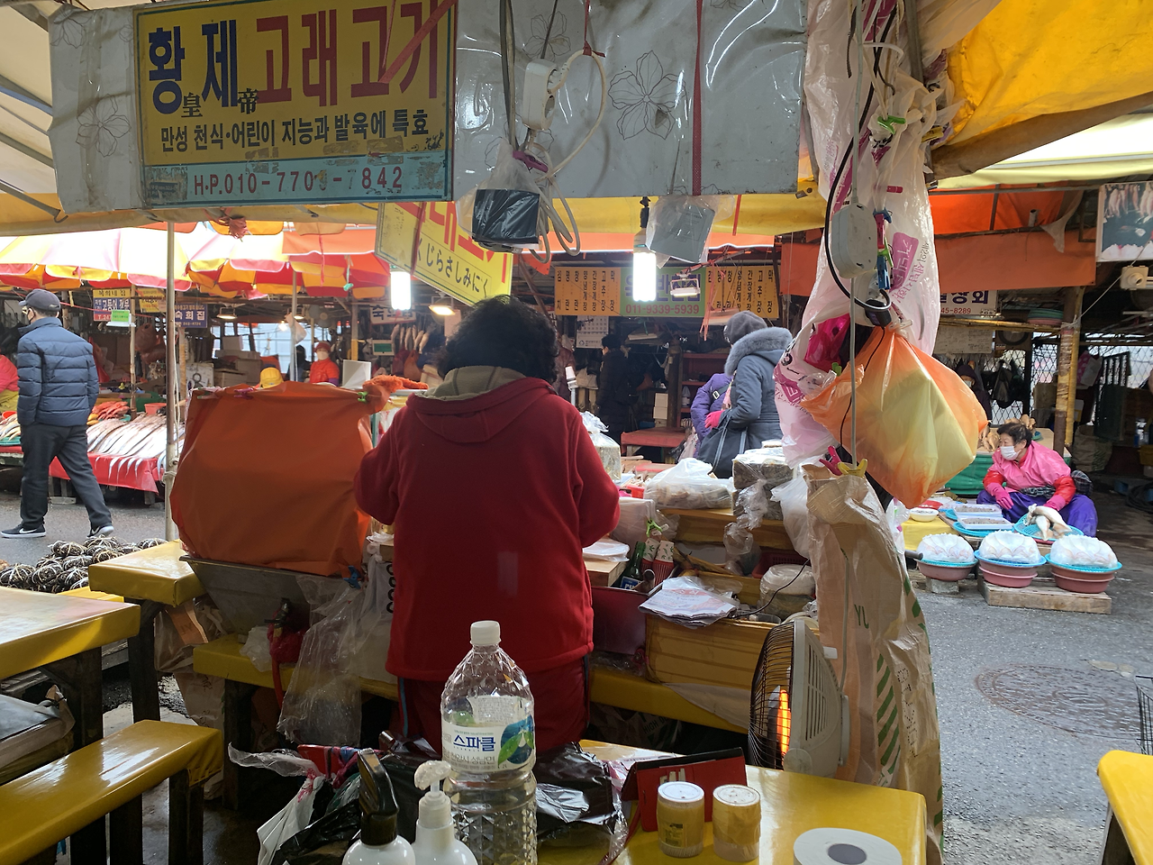 설이 가까이 오자 오랜만에 연락이 와서 그와 자주 만나는 자갈치로 갔다. 우리는 자갈치 시장을 배회하다가 황제가 먹는 고래 고깃집으로 들어갔다. 점포는 길가의 난장이지만 들어가 앉으니 을씨년스러운 원색의 빛깔들이 우리를 반긴다.