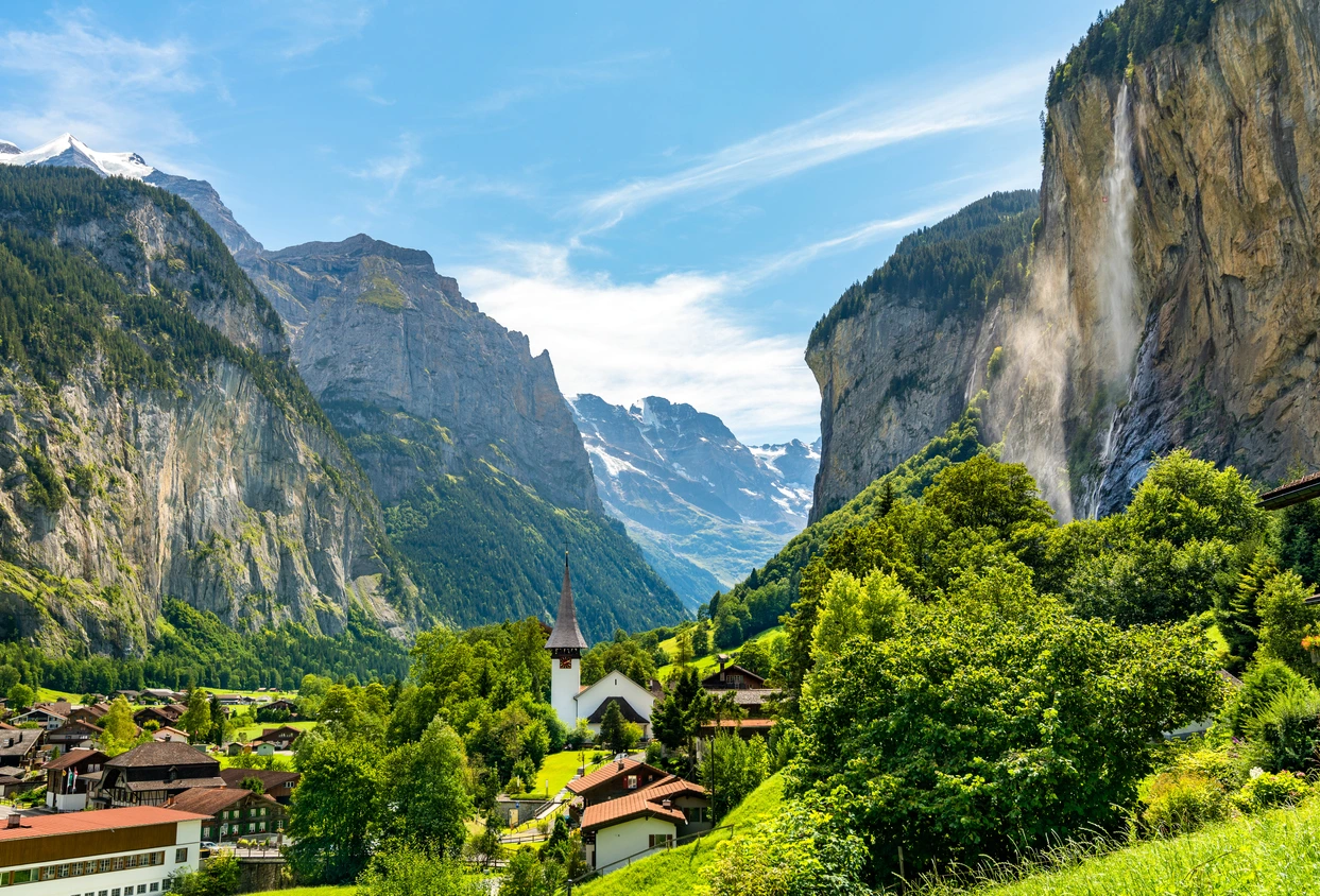 높은 절벽에서 떨어지는 폭포가 있어 울려 퍼지는 샘이라는 뜻을 가진 라우터브루넨은 융프라우가 내려다 보이는 곳에 위치한 작은 마을이다. 역에서 내려 조그만 올라가면 교회와 목장 그리고 절벽으로 이루어진 환상적인 절경을 자랑하는 전망대가 나온다. 이 곳은 전 세계에서 몰려드는 여행자를 위한 융프라우 캠핑장으로 유명하다.