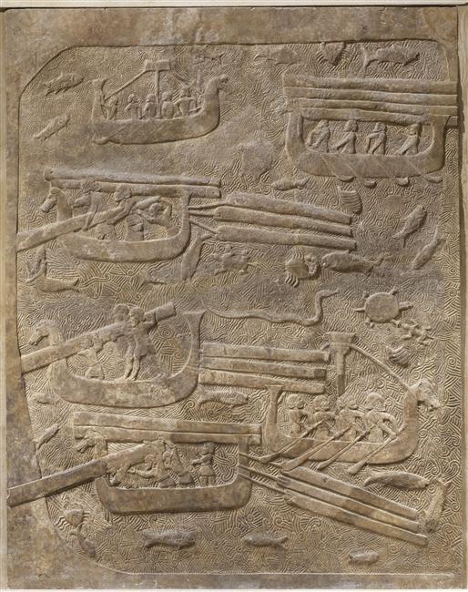 당시 아시리아는 목재가 부족했다. 그래서 왕궁을 짓기 위해 레바논에서 목재를 수입해야 하는데 지금의 이라크 모술에 해당하는 니네베에서 레바논까지 직선거리만 720킬로미터였다. 부조는 레바논에서 삼나무를 자르고 바닷가로 옮긴 후 바다를 거쳐 강 하류에서 상류로 물길을 거슬러 나무를 나르는 모습을 보여주고 있다. 이런 엄청난 사업을 가능하게 하는 것이 바로 아시리아 제국이라는 것을 보여준다.
