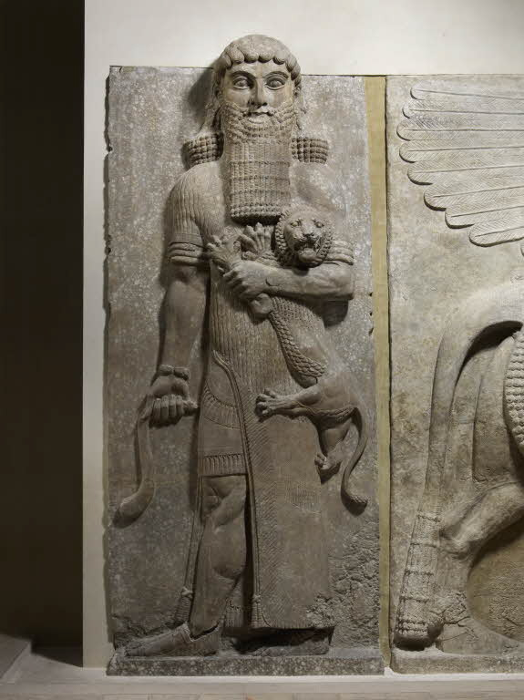 우루크 제1 왕조 5대 왕이었으나 후에 전설적인 영웅이 된 그는 사자를 안고 있다. 당시 사자 사냥은 국민들의 안전과 왕의 용맹을 보여주는 연례행사였다.