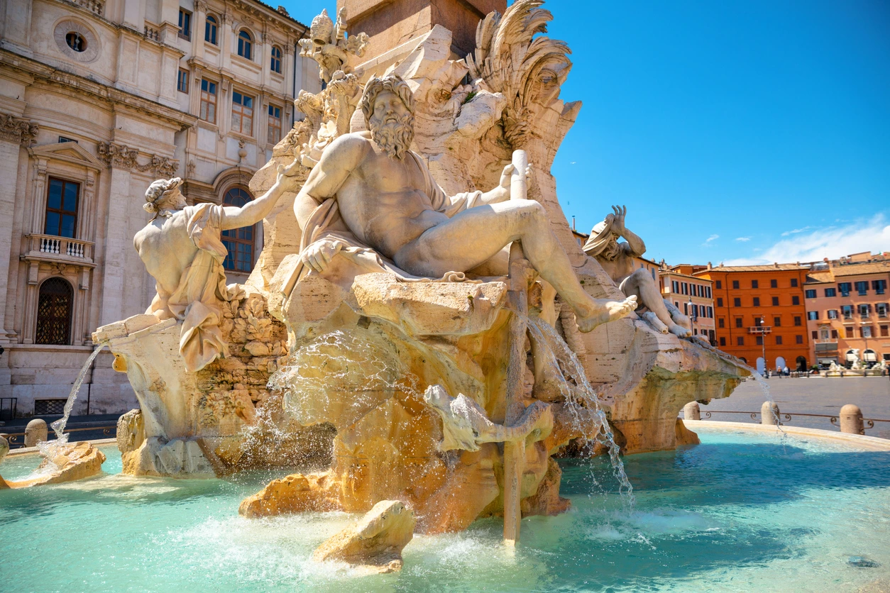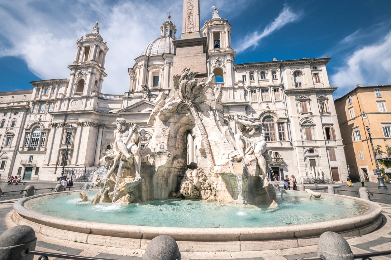 분수대 위로 솟은 오벨리스크는 로마 가톨릭이 이교도를 물리 치려는 열망을 보여주는 것으로 꼭대기에 승리의 상징인 올리브 가지를 물고 있는 비둘기 조각상이 있다. 오벨리스크 아래 두 개의 거대한 교황의 문장이 장식되어 있으며 분수대에는 각 대륙의 강을 상징하는 4개의 조각상이 있다.