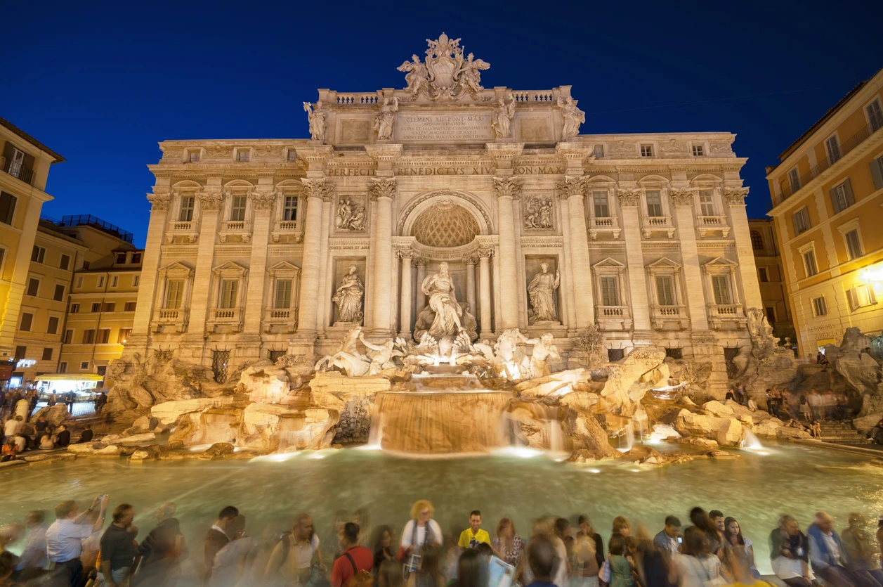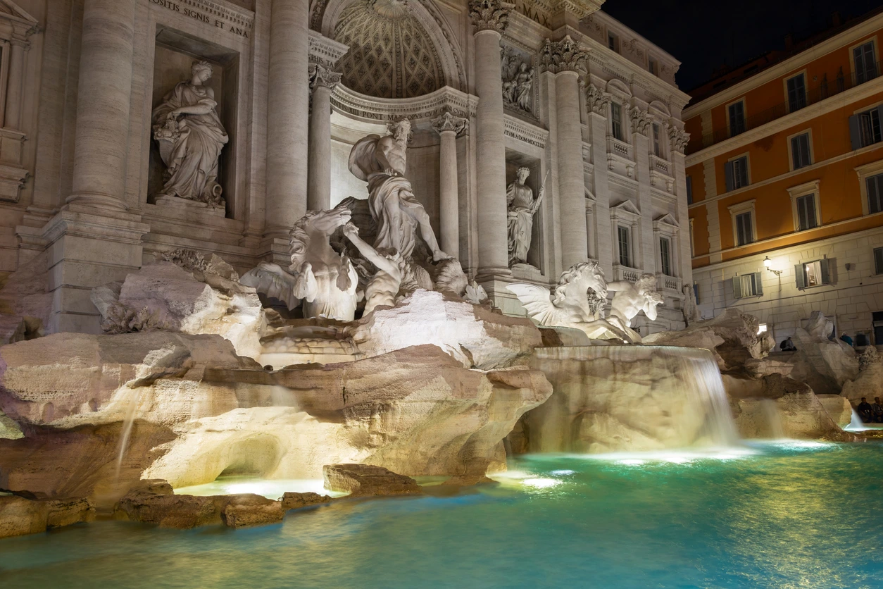 1762년 교황 클레멘스 13세의 지시로 지은 바로크 양식의 트레비 분수는 폴리 궁전을 배경으로 중앙에 바다의 신 넵튠 조각상이 위치하고 있다. 넵튠은 그의 두 아들 트리톤이 이끄는 두 마리의 말을 타고 가는 모습을 하고 있는데 조각 곳곳에 섬세함과 생동감이 넘친다.