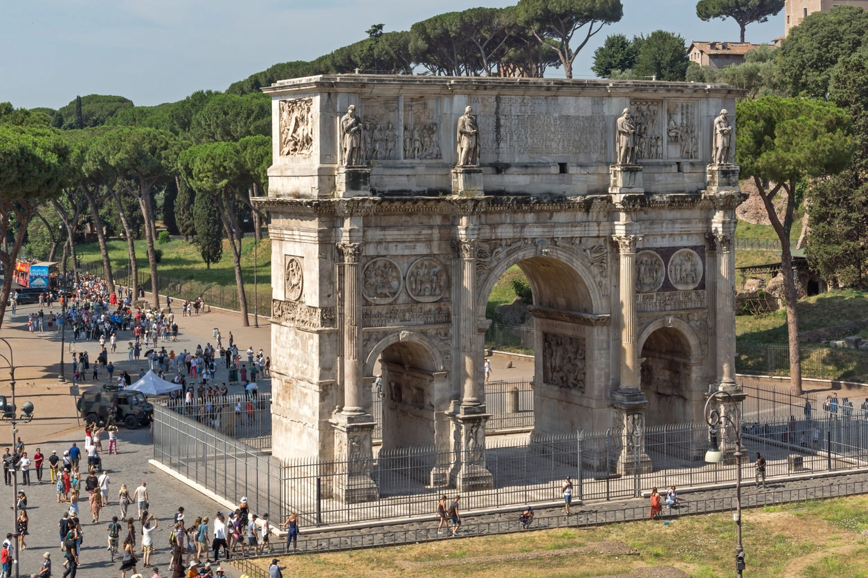 콜로세움을 지나면 정면에 로마에서 가장 크고 잘 보존된 콘스탄티누스 개선문이 나타난다. 312년 밀비오 다리 전투에서 막센티우스 황제에게 승리하면서 로마 제국의 패권을 쥔 콘스탄티누스 황제는 자신의 개선문을 지은 후 개선문 중앙에 다음과 같은 글을 적었다.