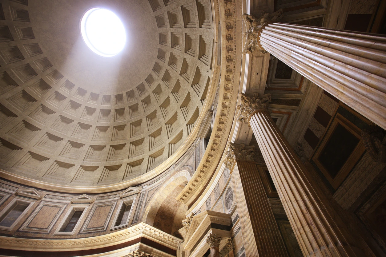판테온으로 입장하면 기둥 하나 없이 세운 거대한 천장 돔에 여행자는 입을 못 다물지 못한다. 천장의 창은 어두운 내부를 밝히는 채광 기능은 물론 환기를 돕는 통풍 기능을 위해 만들어졌다. 미켈란젤로가 천사의 설계라고 극찬한 이곳에 라파엘로의 무덤이 있다.