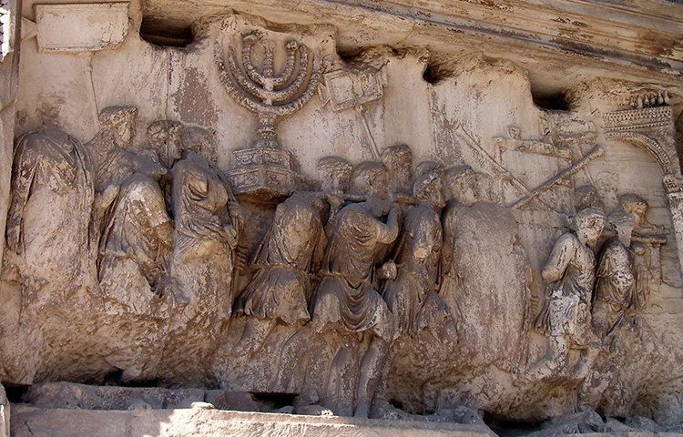 서기 81년 티투스가 사망한 직후 그의 뒤를 이어 황제가 된 동생 도미티아누스가 건설한 티투스 개선문은 티투스가 예루살렘에서 유태인 반란을 진압한 업적을 찬양하는 조각으로 꾸며져 있다. 개선문의 아치 하단 오른편에 로마 병정들이 예루살렘 신전에서 약탈한 보물들을 나르는 모습이 보이는데 당시 가져온 보물과 유대인 포로 4만 명으로 티투스는 콜로세움을 완성하였다. 당시 전쟁의 패배로 유대인은 자신의 국가를 잃어버리고 세계 전역으로 퍼져나갔다.