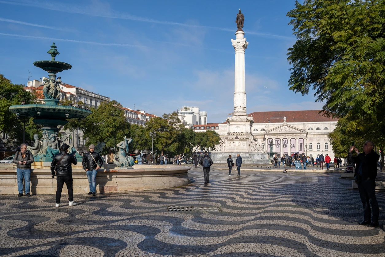 예술을 사랑한 동 페드로 4세의 동상과 프랑스풍의 분수가 있는 호시우 광장은 북쪽에 국립극장이 자리 잡고 있으며 그 주변으로 유서 깊은 건축물과 가페 그리고 상점 등이 들어서 있다. 호시우 광장에서 여행자의 눈길을 사로잡는 것은 바닥에 보이는 물결무늬로 밤이 되면 무늬가 불빛에 반사되어 바닷물이 일렁이는 것 같아 광장을 로맨틱한 공간으로 바꾸어 놓는다.