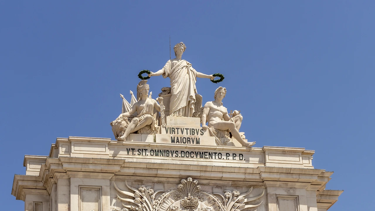 포르투갈어로 무역을 뜻하는 코메르시우 광장 입구에 있는 개선문에는 마리아 1세가 아테나 여신과 리스본의 수호신에게 월계관을 수여하고 있는 조각상이 있다. 그 아래로 폼팔 백작과 바스코 다가마의 조각상이 보인다. 또한 광장 중앙에는 주제 1세의 동상이 있다. 그들은 모두 포르투갈의 경제적 발전에 결정적 기여를 한 인물들이다,