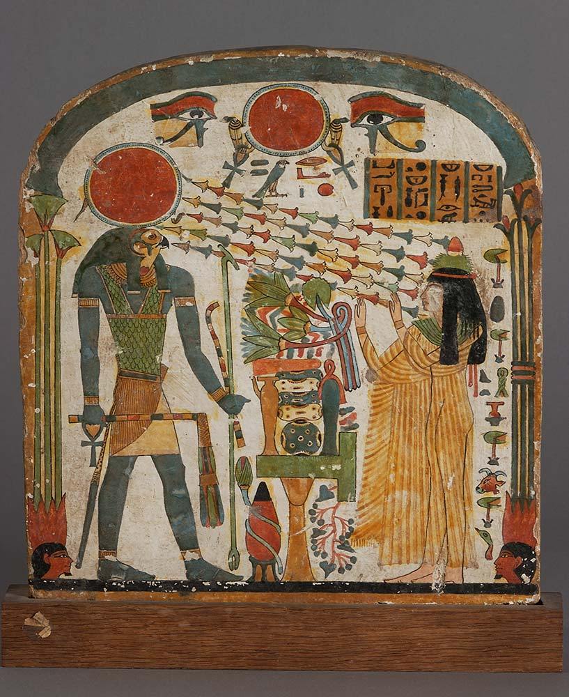 비문에는 고인이 태양신을 숭배하는 내용이 담겨 있다. 먼저 비문의 앞면을 살펴보면 매의 머리 형상을 하고 붉은색의 태양 원반을 쓰고 있는 신이 보인다. 태양을 상징하는 레 호라크티 신이다. 그는 오른손에 채찍과 생명의 십자가를 들고 있다.