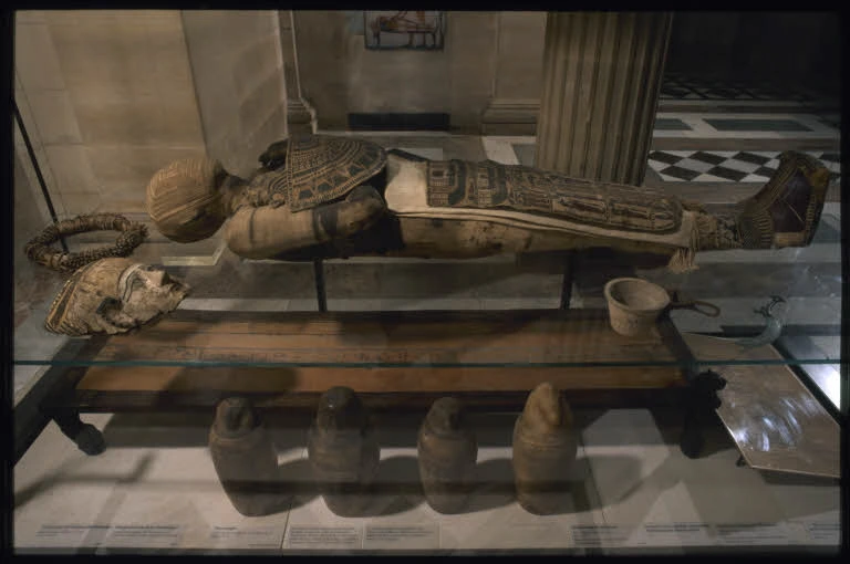 상자 아래 진열장에 전시된 파피루스에는 고인이 오시리스 앞에서 심장의 무게를 측정하는 그림이 보인다. 또한 관 옆에는 그 앞으로 그의 내장을 담은 카노푸스 단지가 보인다. 고대 이집트의 방부 처리 기술은 상당히 발전했는데 이중 제일 중요한 것은 신체가 부패 되는 것을 방지하기 위해 내장을 제거하는 것이었다. 그래서 내장을 제거하여 방부 처리한 후 소금으로 덮어서 건조한 다음 천으로 포장하여 항아리에 넣었다.