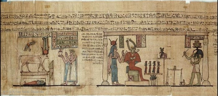 파피루스 오른쪽에는 저승의 신인 오시리스가 의자에 앉아 있다. 그의 얼굴색은 녹색으로 농업의 신이며 푸른 식물처럼 두 번을 죽고 부활하였다는 것을 상징한다. 오시리스 뒤로 이시스가 보이며 오시리스 앞에는 카누푸스 단지가 보인다. 이는 죽은 자의 장기를 보호하는 단지이다.