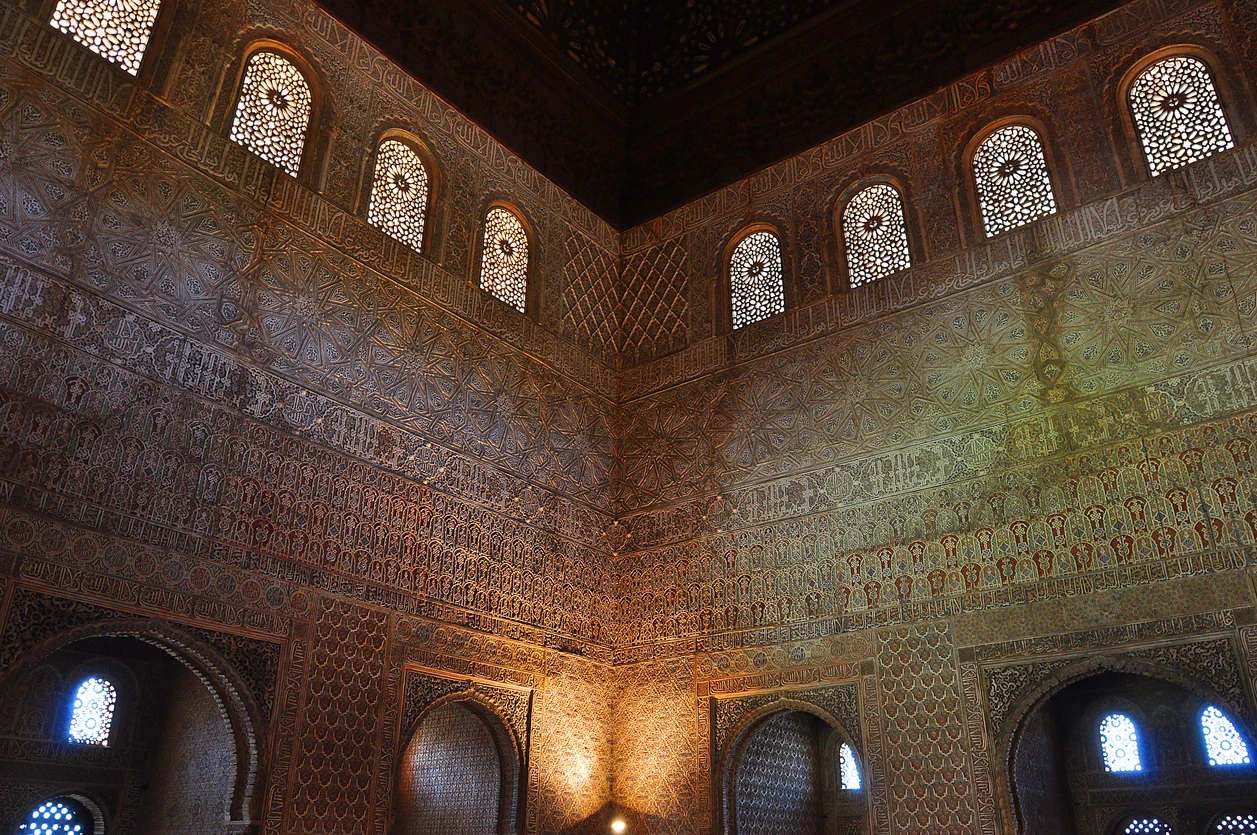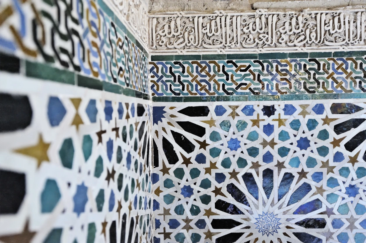 타일 위로 방을 장식하는 아라베스크 문양을 살펴보면 말굽 모양의 아치 문양과 연속적인 반원 무늬 그리고 기하학적인 무늬가 무한히 반복하며 방안의 모든 것은 이미 이 세상을 초월해 신에게 다가가고 있다. 아라베스크 문양 중간에는 비문으로 가득 차 있는데 비문에는 다음과 같은 시구절이 새겨져 있다.