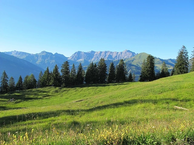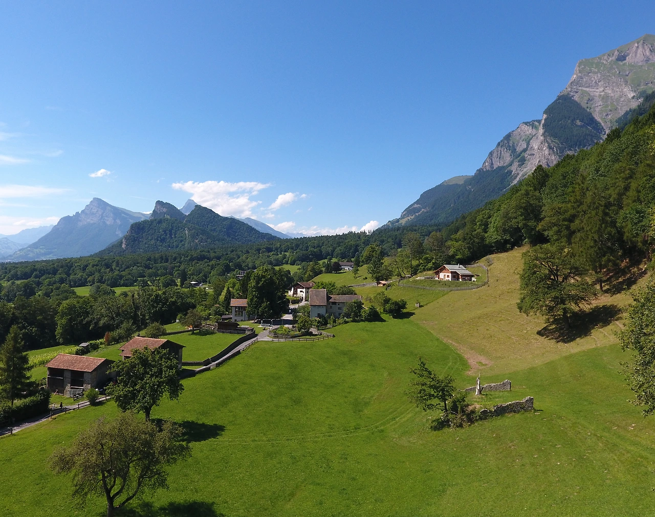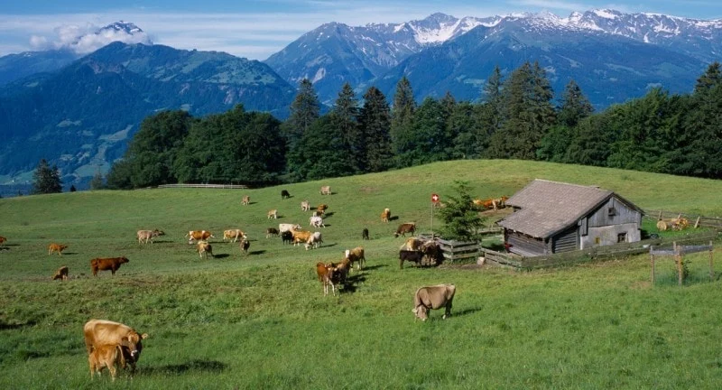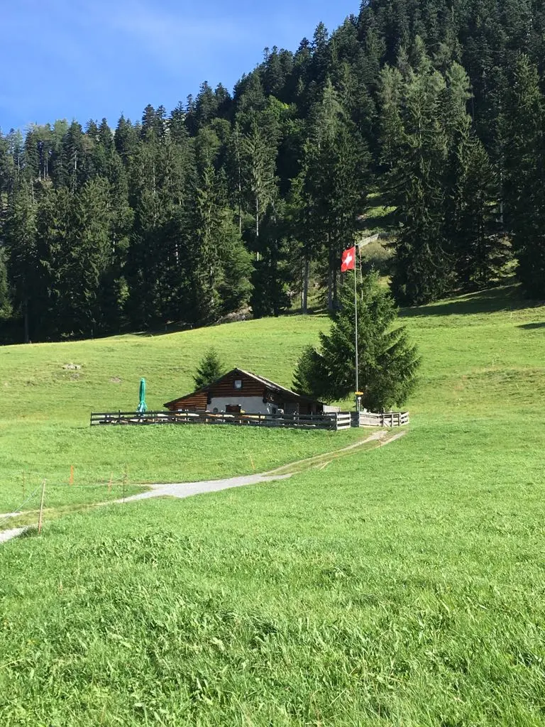 빨간색 스위스 국기가 휘날리는 하이디의 여름 집은 만화 속 전경처럼 눈 덮인 알프스와 끝없이 펼쳐진 푸른 초원을 배경으로 우뚝 서 있다.
